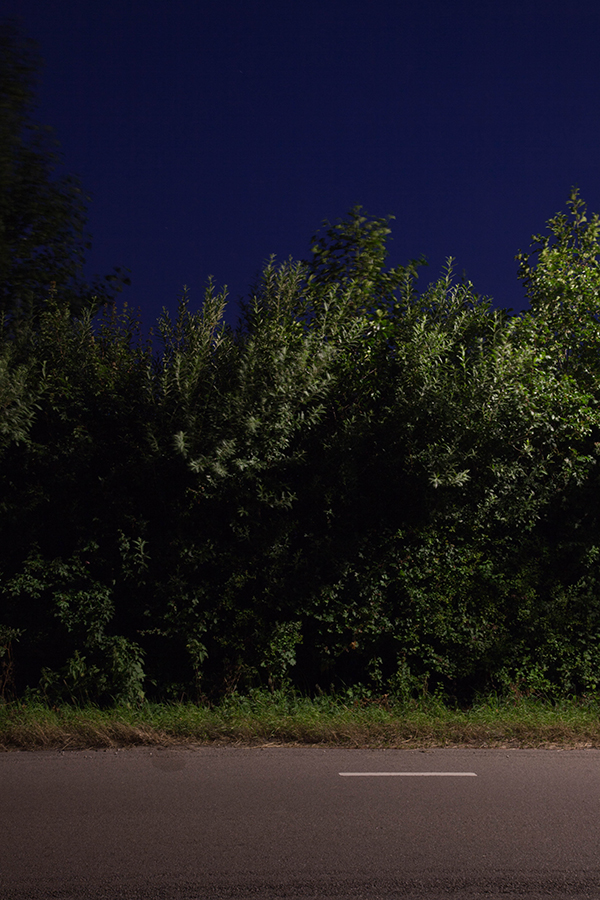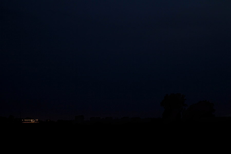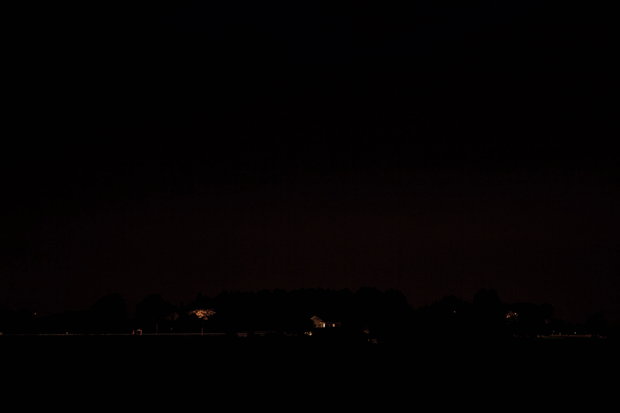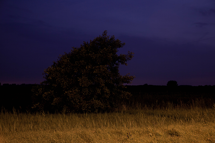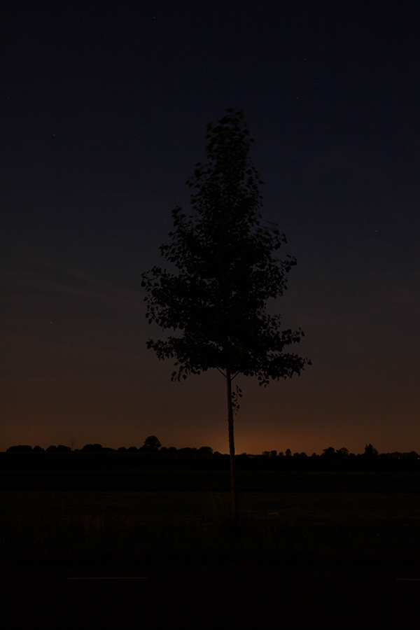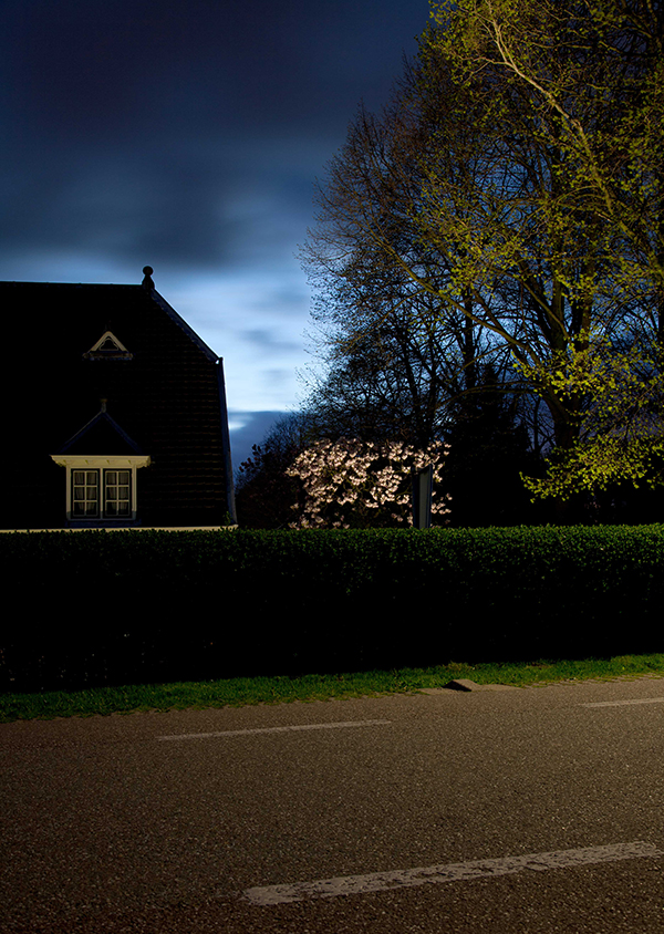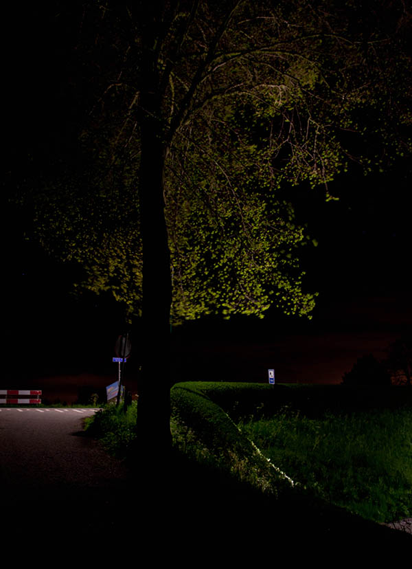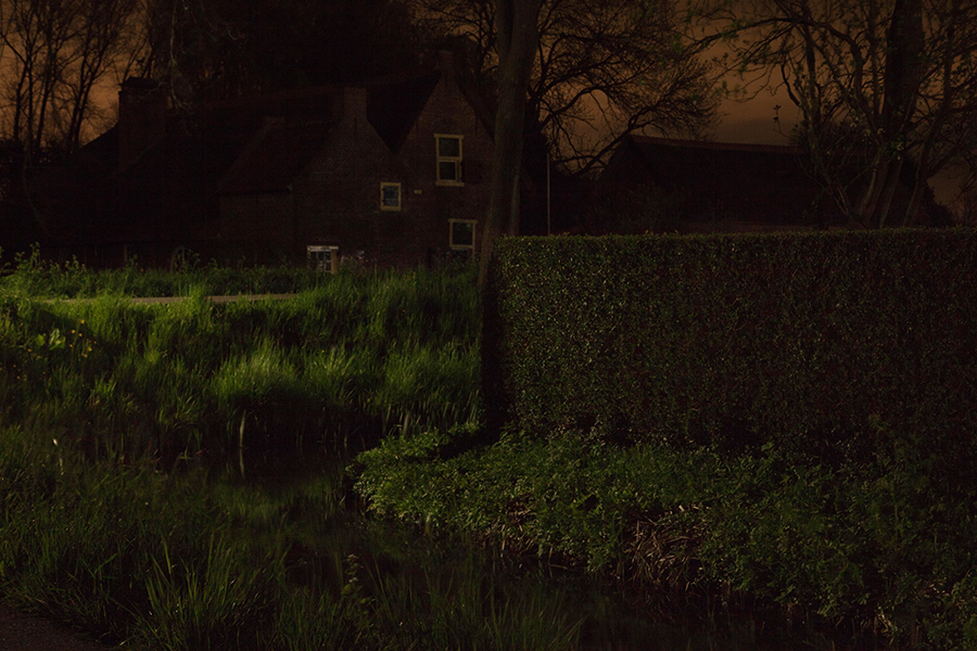 Op een zomernacht in 2013 doorkruist een donkerblauwe Ford Fiesta de Lopikerwaard. Aan het stuur zit Merlijn van der Wardt (IJsselstein, 1977), op de achterbank liggen een statief en een Canon EOS 5D. De wind waait, de bomen ruisen, een hond blaft, een boer wordt wakker, schuift het gordijn opzij en tuurt naar buiten. De Lopikerwaard, een rechthoekig poldergebied in het Groene Hart, wordt ingeklemd tussen de Hollandse IJssel in het noorden en de Lek in het zuiden. De dorpjes heten Zevender, Polsbroek, Uitweg of Cabauw; aan de dijk rondom liggen Oudewater, Montfoort, IJsselstein en Lopik. Vergeleken bij het overgrote deel van de Randstad is het er dunbevolkt en donker. Het donker is wat Merlijn wil vastleggen. Als het even kan op de rustigste nachten van de week, die van zondag op maandag, trekt hij eropuit. Door de inwoners wordt hij met achterdocht tegemoet getreden, en het is natuurlijk ook ongewoon, een fotograaf in de nacht. Merlijn heeft het gevoel dat hij iets illegaals doet. Het tweede dat hem zal bijblijven is het altijd klinkende geluid van de bomen, het riet en het gras in de wind. En wat hem ten slotte opvalt is dat juist de aanwezigheid van kunstlicht het donker accentueert: een lantaarnpaal, de lichtjes langs een snelweg in de verte. ‘Lichten die de nachten intact laten’ - het is een zinsnede uit Vallende ouders van A.F.Th. van der Heijden. Juist door dat kunstlicht is het gevoel dat sommige beelden oproepen unheimisch en lijkt er gevaar om de hoek te schuilen. Merlijn streeft naar eenvoud in zijn fotografie, maar zonder mystiek blijven de foto’s leeg. Sommige onderwerpen, zoals de te fel, of een paar kilometer verderop helemaal niet verlichte sluizen in de Lek, laat hij passeren. Het beeldscherm op zijn camera is klein. Pas ‘s ochtend thuis kan hij het resultaat van zijn inspanningen goed beoordelen: foto’s waarvan hij veel verwacht, blijken tegen te vallen; andere pakken poëtisch of esthetisch verrassend goed uit. Zo, in vijftien voorjaars- en zomernachten, ontstaat langzaamaan een serie, die de mensen uit de streek tijdens de Atelierroute Lopikerwaard op 6 september 2013 voor het eerst zien. Aandachtig zoeken ze naar herkenningspunten. ‘Goh ja,’ zegt iemand. ‘Zo ziet het eruit. Maar zo kijken we er nooit naar.’ Carel Helder, 12 januari 2014